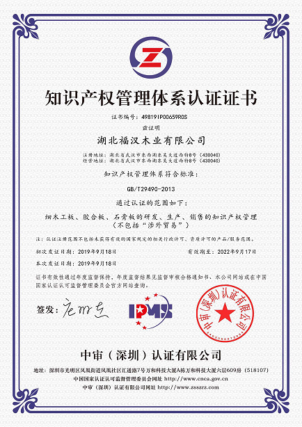 熱烈祝賀湖北福漢木業(yè)有限公司于2019年9月獲得知識產權貫標認證證書,這意味著湖北福漢木業(yè)在知識產權領域獲得到重要認可,在知識產權方面得到進一步規(guī)范和在綜合競爭力得到進一步提升。